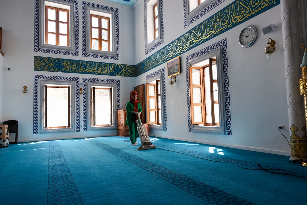 Bayram sabahı ilçe sakinlerinin ibadetlerini gerçekleştireceği camilerde ve türbelerde tatlı bir telaş yaşanıyor. İlçedeki tüm camilerde yıl boyu düzenli temizlik hizmeti veren mobil ekipler, bayram öncesinde de cami ve türbelerin iç ve dış mekânlarını temizliyor. Arife günü ise bayrama özel her caminin avlu ve girişi yıkanacak.