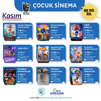 Ara tatil boyunca Beykozlu çocuklar, Aslan: Hürkuş Kayıp Elmas, Mutlu Canavar Ailesi 2, Kirpi Sonic 3, Ters Yüz 2, Rafadan Tayfa: Göbeklitepe, Elemental: Doğanın Güçleri, İstanbul Muhafızları, Mufasa: Aslan Kral ve Alvin ve Sincaplar gibi sevilen animasyon filmlerle buluşacak.