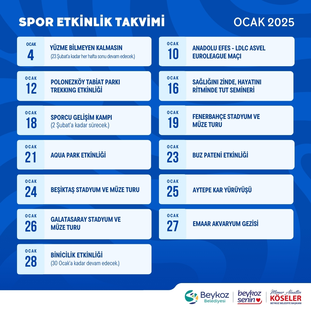 Beykozlulara yüzmeden buz patenine, stadyum gezilerinden doğa yürüyüşlerine ücretsiz spor olanağı sunan ocak ayı etkinlik takvimi yayınlandı.