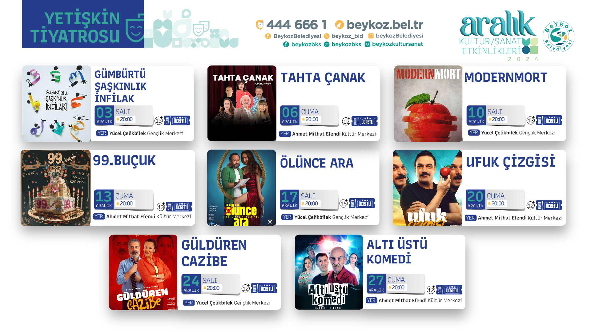 Aralık ayında yetişkinlere yönelik sahnelenecek olan oyunlar, mizahın ve dramın iç içe geçtiği eserlerle izleyicilere sanatsal bir yolculuk vaat ediyor.