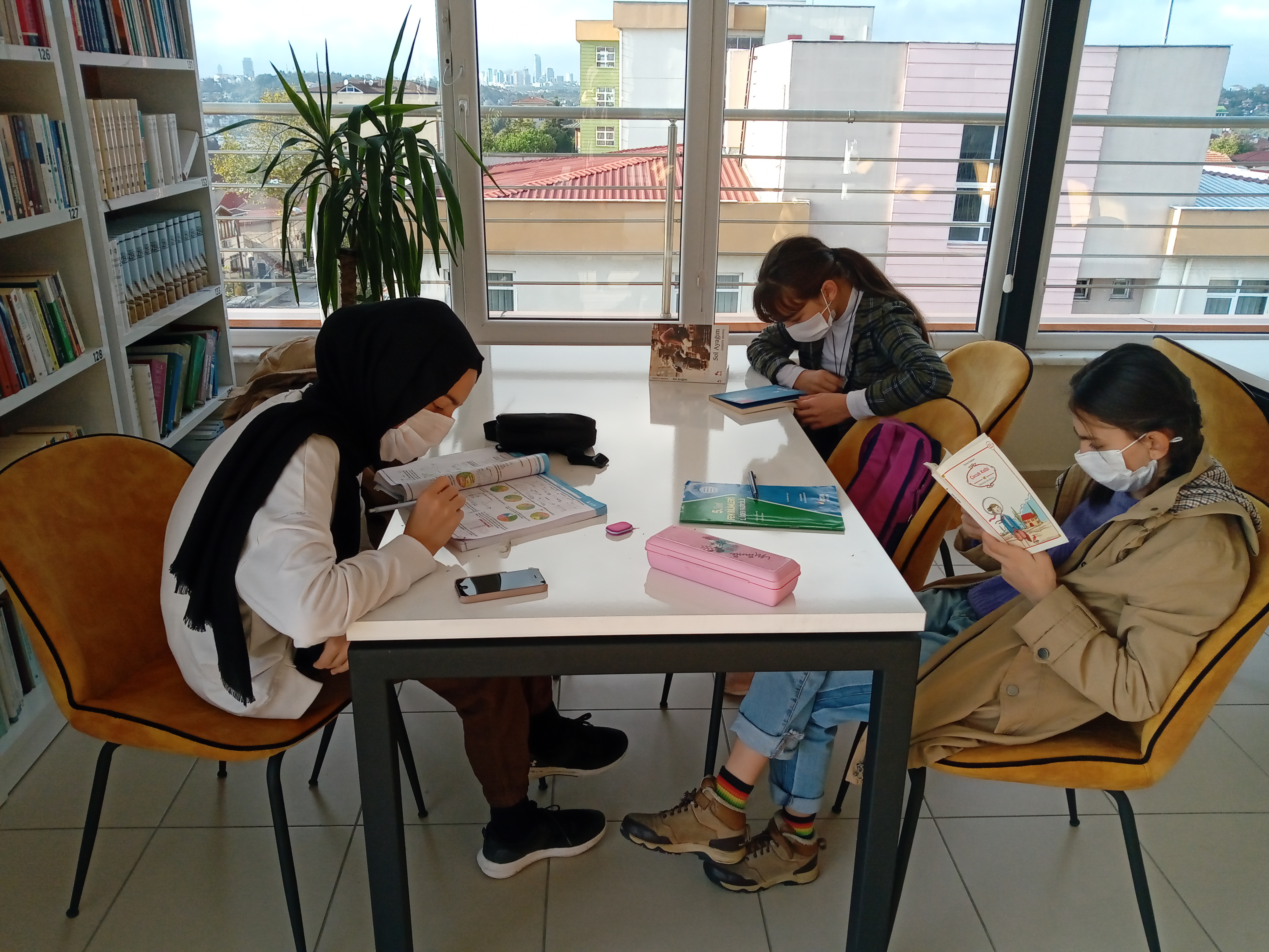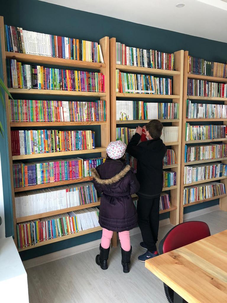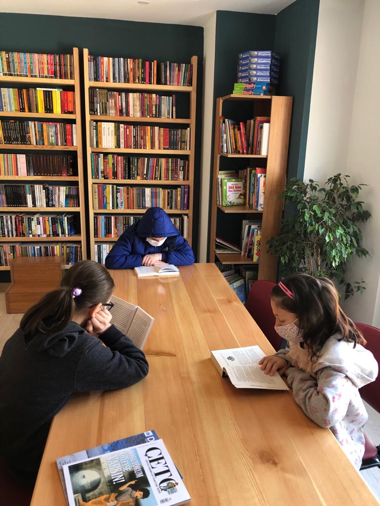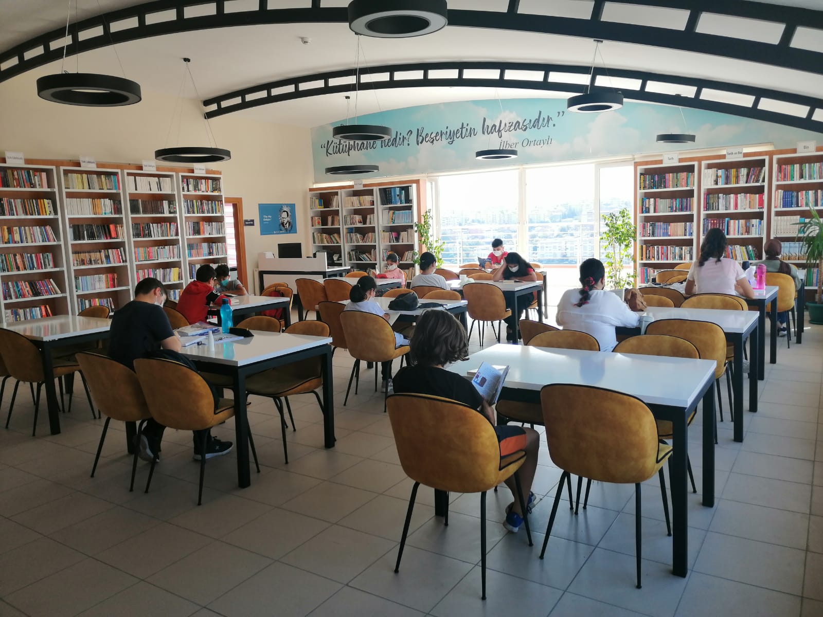 Açık raf sistemiyle hizmet veren kütüphaneye gelen çocuklar, birbirinden renkli kitapların arasında keyifle kitap okuyor, ders çalışıyor.