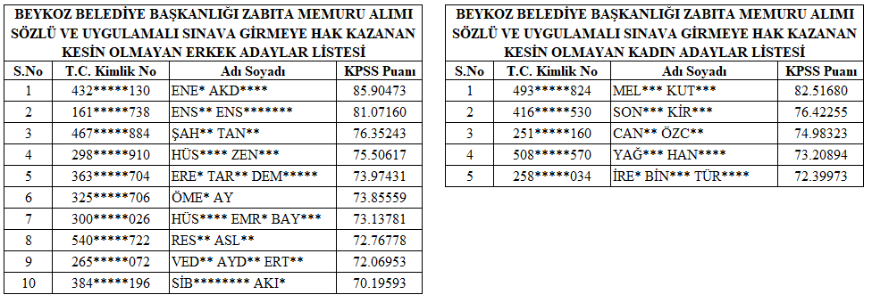 Yapılan değerlendirme neticesinde; başvuru genel ve özel şartlarını taşıyan başvurular KPSS puanlarına göre sıralanarak, en yüksek puanlı adaydan başlamak üzere atama yapılacak her bir kadro için beş katı oranında aday sınava katılmaya hak kazanmış olup; kadro bazında sözlü ve uygulamalı sınava girmeye hak kazananları gösteren kesin olmayan aday listeleri aşağıda sunulmuştur.