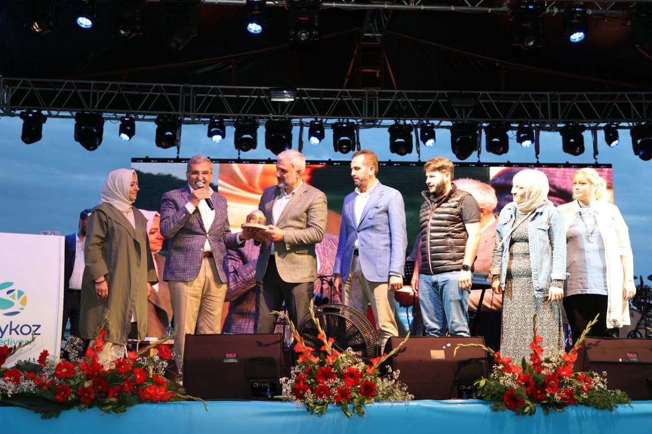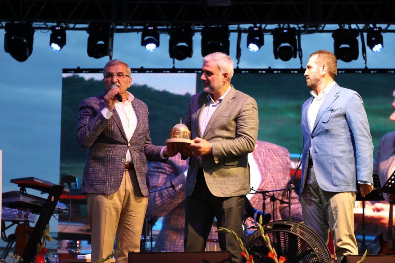 Belediye Başkanı Murat Aydın açılışa iştirak eden AK Parti İl Başkanı Osman Nuri Kabaktepe’ye ilçeye özgü cam işçiliğiyle yapılmış minyatür Ayasofya Kubbesi hediye etti.