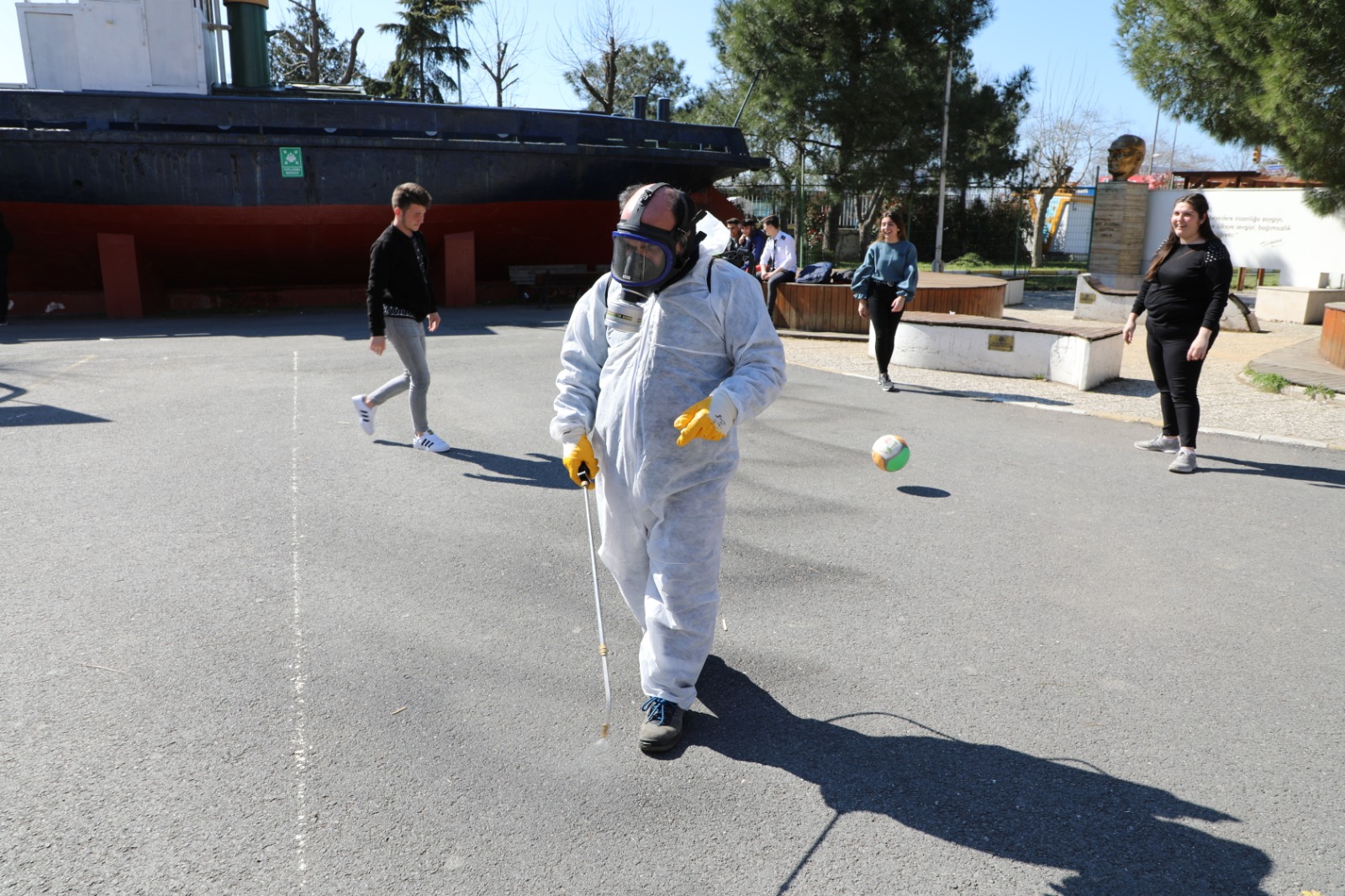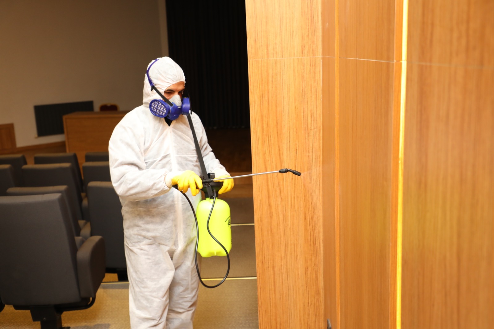 Özel kıyafetli personeller tarafından yapılan ilaçlama çalışmalarında kamu binalarında iç mekanlar, bürolar, salonlar, fuayeler, tuvaletler, bahçeler ve tüm ortak kullanım alanları etkili solüsyonlarla dezenfekte ediliyor.
