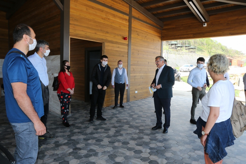 Ardından sosyal mesafe kurallarına uygun olarak tesisisin mesire, plaj, kafeterya ve yapımı devam eden diğer ortak kullanım alanları gezildi.