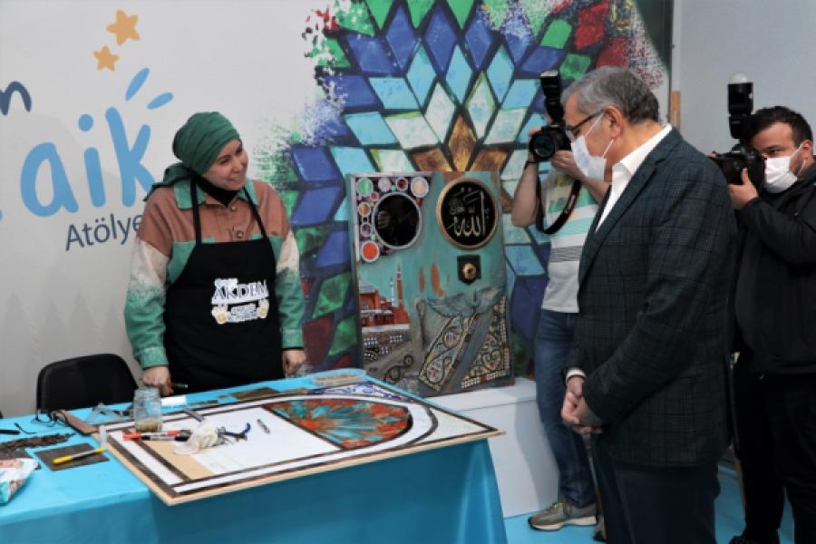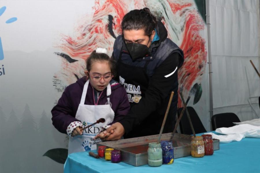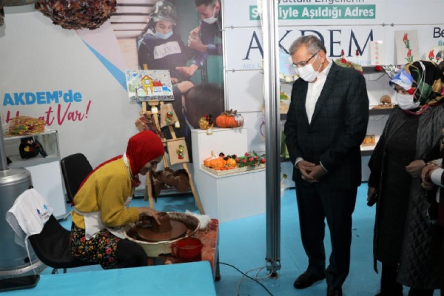 Merkezde eğitim alan engelli çocuk ve gençler, etkinlik alanında kurulan ebru, cam, mozaik, seramik, mutfak ve tarım atölyelerinde iki gün boyunca hocaları eşliğinde el becerilerini gösterdi.