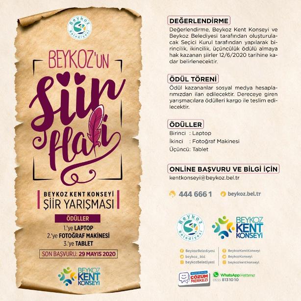 Beykoz’u en güzel anlatan şiirlerin ilçenin kültür-sanat belleğine kazandırılacağı yarışmanın birincisine laptop, ikincisine fotoğraf makinesi, üçüncüsüne ise tablet hediye edilecek.