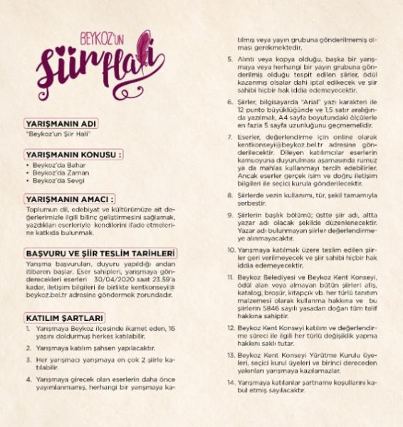 Adaylar yarışmaya “Beykoz’da Zaman”, “Beykoz’da Bahar” ve “Beykoz’da Sevgi” konularını ele aldıkları en fazla 2 şiirle katılabilecek. Şairlerin özgür üretimi göz önüne alınarak şiirlerde şekil, tür ve vezin kullanımı ise serbest bırakıldı.