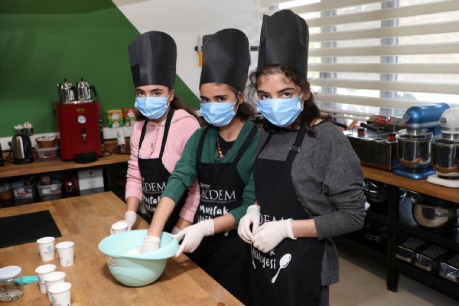 Beykoz’da yaşayan hafif zihinsel engelli Rümeysa (21), Sümeyye (19), Sevde (16) Başkaya kardeşler, babaannelerinin azmiyle geldikleri, Aile, Kadın Destekleme ve Engelliler Merkezi (AKDEM)’in sevgi dolu ortamında sanat ve mutfak eğitimiyle hayata gülümsüyor.