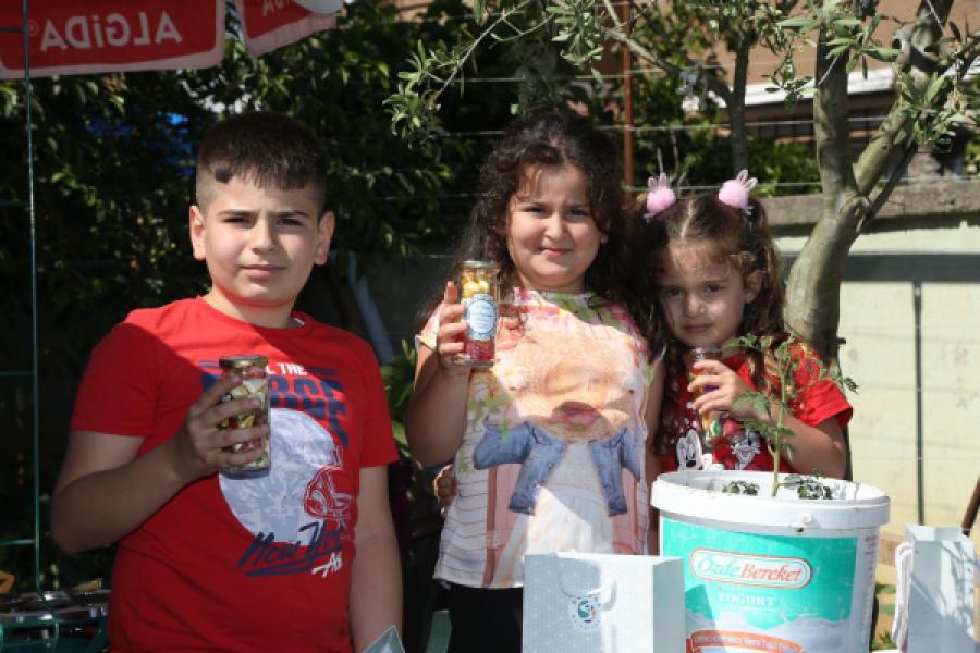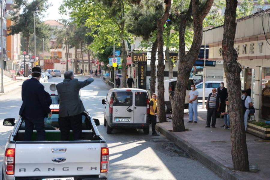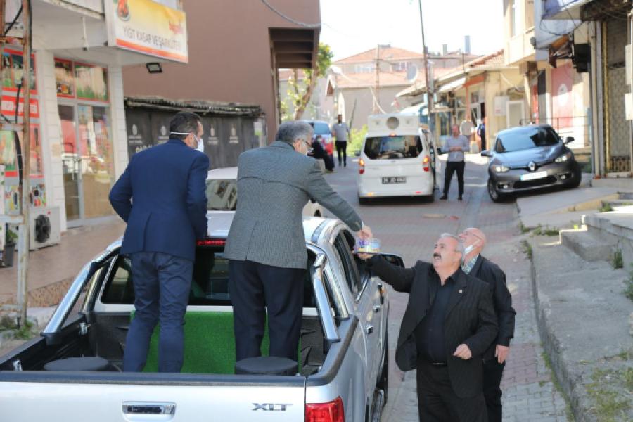 Vatandaşları sosyal mesafe kuralına uygun olarak araç üzerinden selamlayan Başkan Murat Aydın evlerinin bahçelerinde oynayan çocuklara şeker verdi.