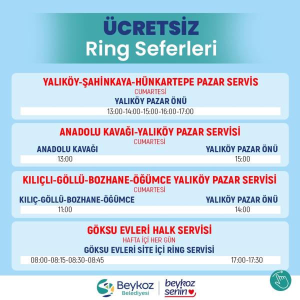 Beykoz Belediyesi’nin ücretsiz ring seferleri, belirli gün ve saatlerde aktif olarak hizmet verecek. İşte detaylı sefer bilgileri: