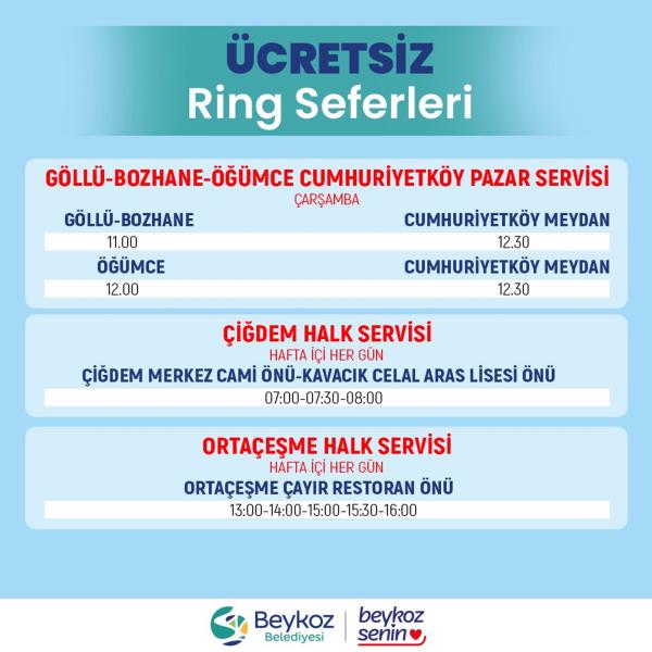 İlçede daha fazla noktaya, daha rahat ulaşım imkânı sunan ring hizmetiyle Beykozlular; çarşı, pazar, sağlık ve sosyal alanlara kolaylıkla erişebilecek. Beykoz Belediyesi, modern araç filosu ve düzenli sefer saatleriyle vatandaş memnuniyetini ön planda tutuyor.