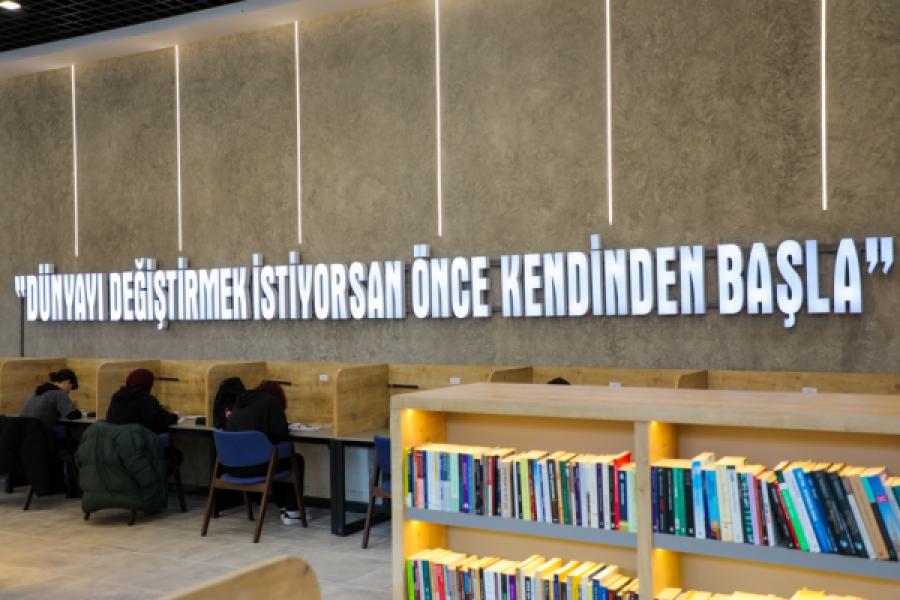 Aynı anda 52 kişinin ders çalışabildiği kıraathanede farklı türde eserlerin yer aldığı zengin içerikli 11 bin kitaplık kütüphane kitapseverleri bekliyor.