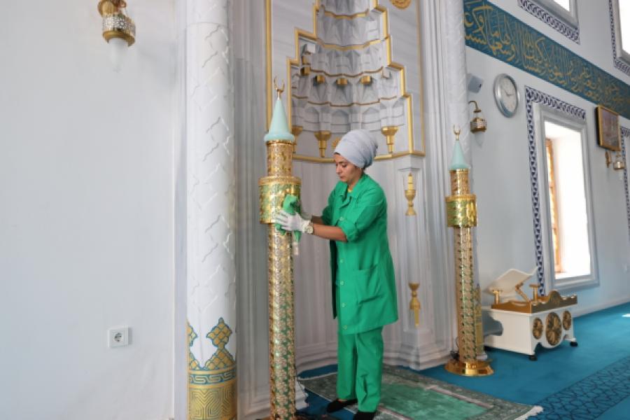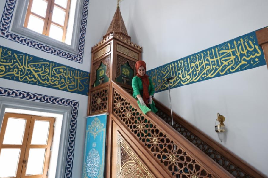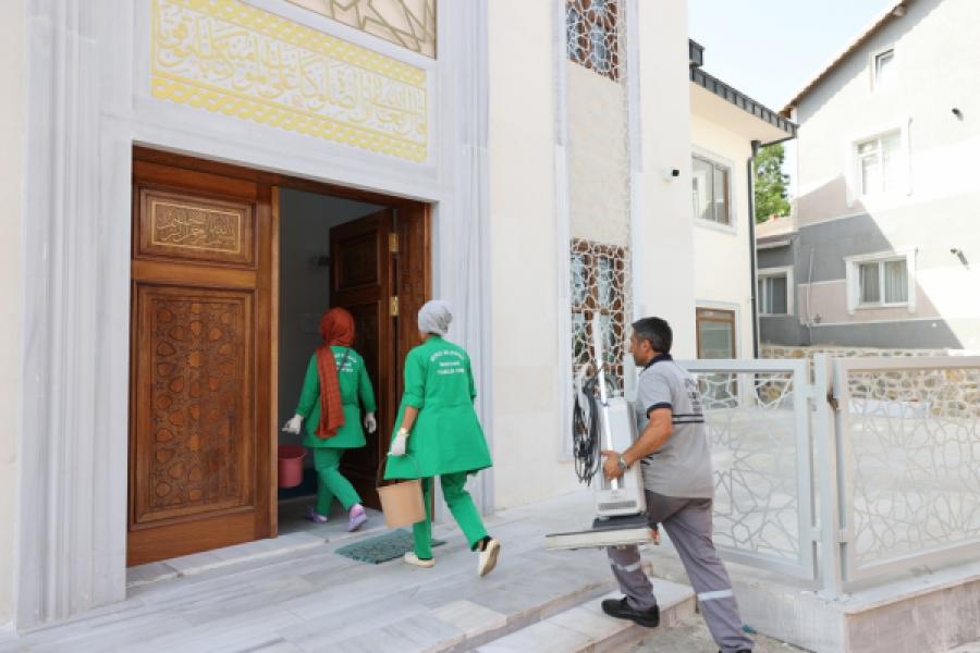 Bayram sabahı ilçe sakinlerinin ibadetlerini gerçekleştireceği camilerde ve türbelerde tatlı bir telaş yaşanıyor. İlçedeki tüm camilerde yıl boyu düzenli temizlik hizmeti veren mobil ekipler, bayram öncesinde de cami ve türbelerin iç ve dış mekânlarını temizliyor. Arife günü ise bayrama özel her caminin avlu ve girişi yıkanacak.