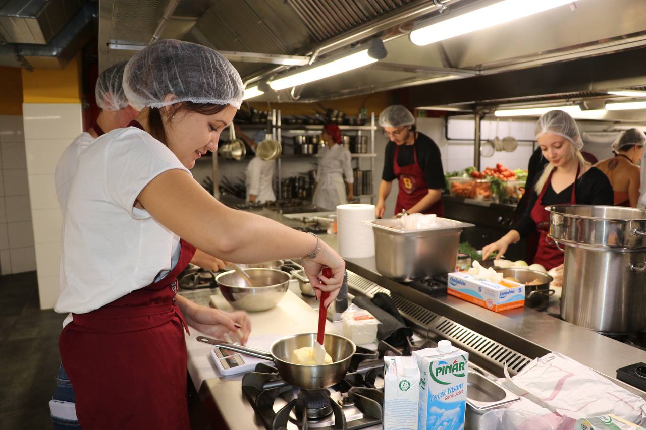 Fransız gençler tost ekmeğiyle, ünlü Oui Oui Baguette hazırlarken, Portekiz grubu Patanişka, Beykozlu gençler de Türk Mutfağı’nın baş tacı Zeytinyağlı Enginar pişirdi. Yemeklerin hazırlanmasına üniversitenin gastronomi öğrencileri de eşlik etti.