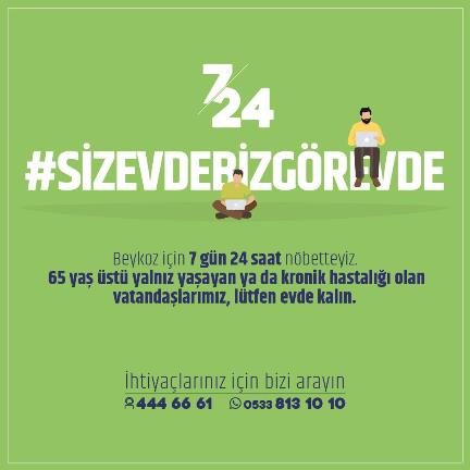 Beykoz Belediyesi koronavirüs salgını tehlikesi nedeniyle hem ilçedeki mücadele çalışmalarının koordinasyonu hem evinden çıkması riskli olan, kronik hastalığı bulunan, yalnız yaşayan 65 yaş ve üstü yaşlılar ile ihtiyaç sahipleri için 7/24 nöbet tutuyor.