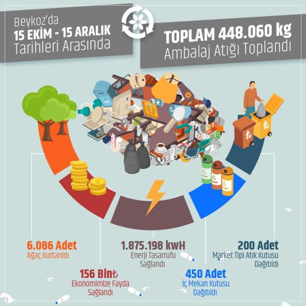 15 Kasım-15 Aralık tarihlerini kapsayan 1 aylık periyotta ise 448 bin 066 kg ambalaj atığı toplandı. Toplanan atıklarla 1 ayda 6 bin ağaç yeşil kalırken, 1 milyon 875 bin 198 kwH’lık enerji tasarrufu ve mili ekonomiye 156 bin TL’lik katkı sağlandı.