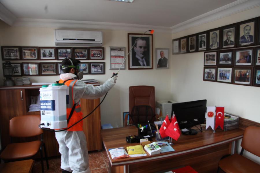 Vatandaşların hizmet için geldiği kamu binaları, taksi, taksi durakları, otobüs durakları ile ortak yaşam alanları her gün ilaçlanırken diğer alanlar haftada 2 günlük periyotla dezenfekte ediliyor.