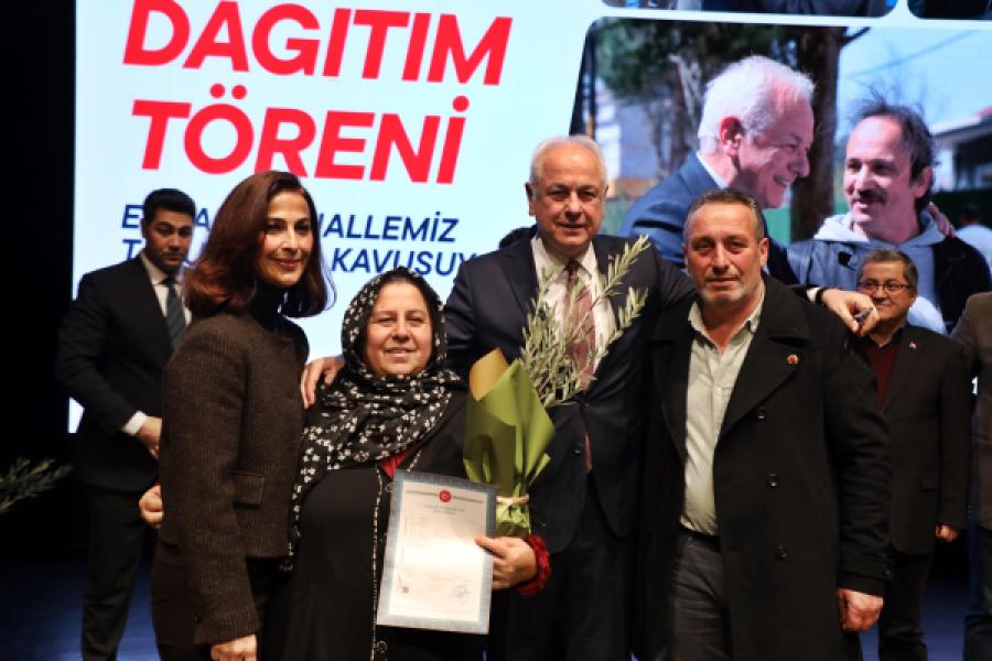 Başkan Köseler’in konuşmasının ardından hak sahiplerine tapuları takdim edildi. Tapuları eşi Firdevs Köseler, başkan yardımcıları ve birim müdürleri ile birlikte hak sahiplerine takdim eden Beykoz Belediye Başkanı Mimar Alaattin Köseler, bereketi temsil eden zeytin ağacı fidesi de armağan ederek tapuların hayırlı olmasını diledi.