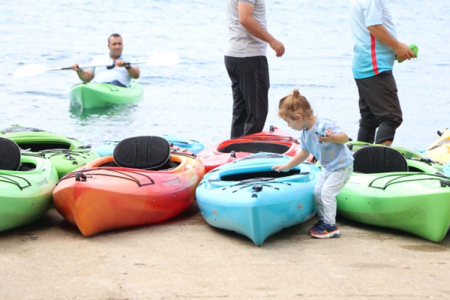 Aileleriyle sahile gelen çocuklar da ilk kez kanoyla tanışıyor.