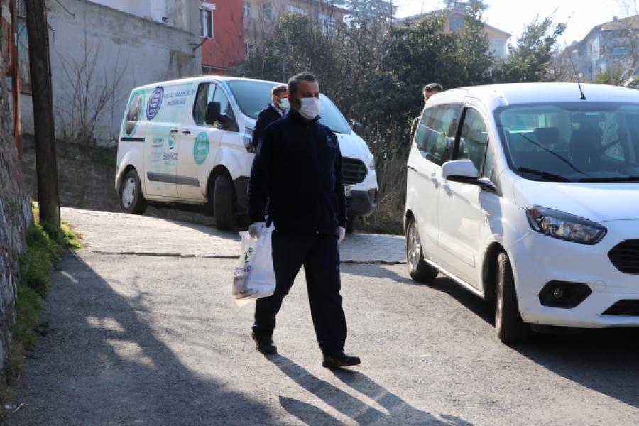 Öğlen ve akşam öğünü olarak hazırlanıp hijyen koşullarına uygun olarak paketlenen yemekler ekipler tarafından araçlarla evlere tek tek teslim ediliyor.