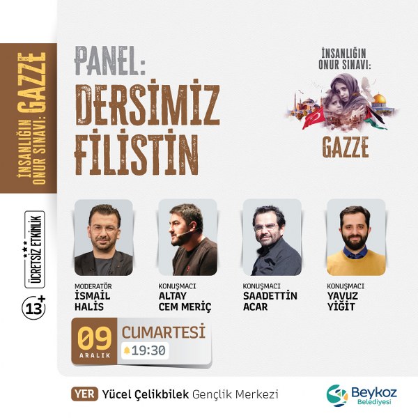 Beykoz Belediyesi tarafından, 75 yıldır İsrail’in işgal ve zulmüne uğrayan Filistin halkının sesini kültür- sanat yoluyla duyurmak amacıyla “İnsanlığın Onur Sınavı: Gazze” başlığıyla ilçede düzenlenen etkinlikler “Dersimiz Filistin” Paneli” ne ev sahipliği yapacak.