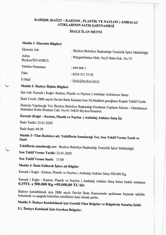 Karışık (Kağıt, Karton, Plastik ve Naylon) Ambalaj Atıklarının Satış Şartnamesi