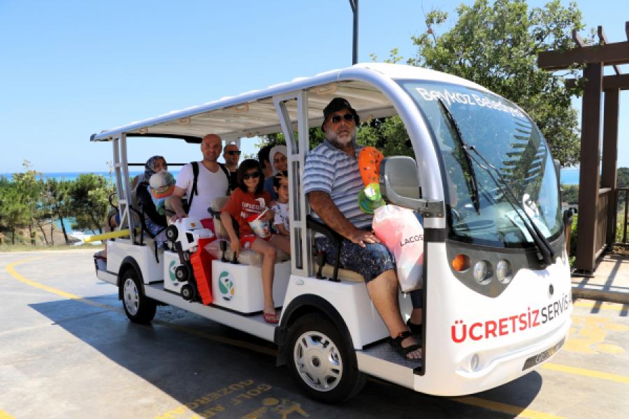 Alana gelen tatilciler girişte talep ederlerse plaja elektrikli servis araçlarıyla taşınıyor.