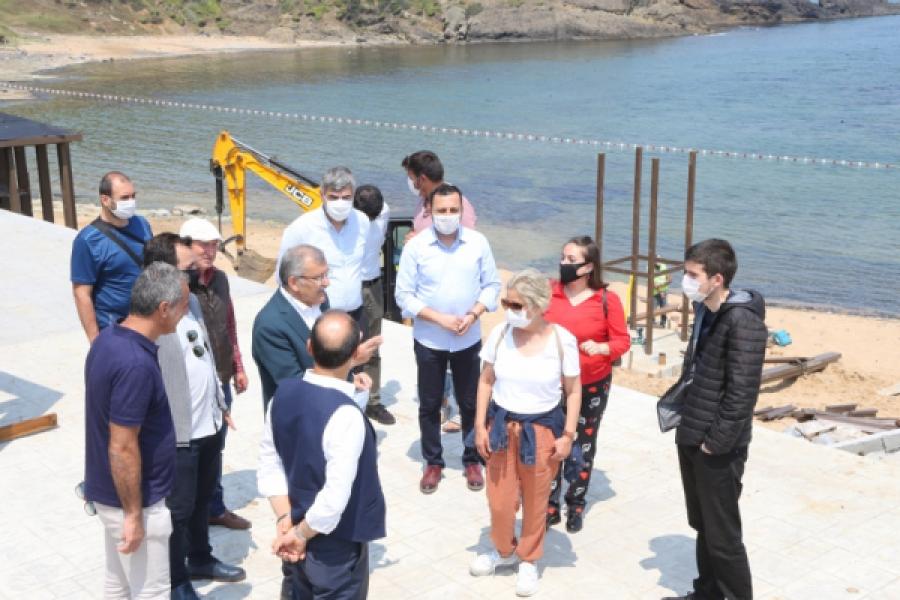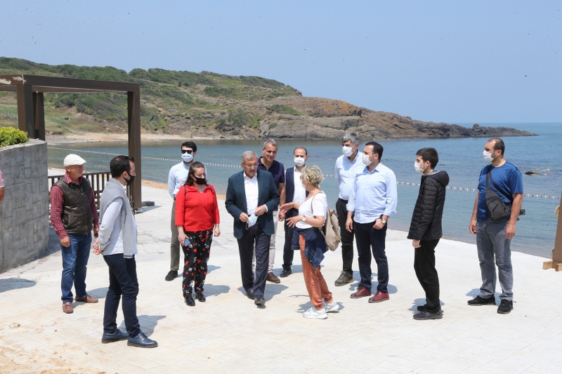 Ardından sosyal mesafe kurallarına uygun olarak tesisisin mesire, plaj, kafeterya ve yapımı devam eden diğer ortak kullanım alanları gezildi.