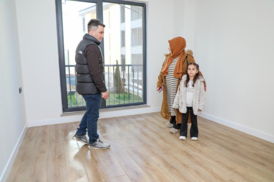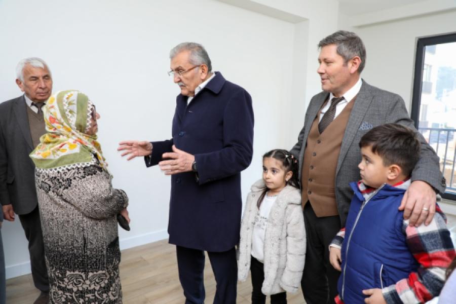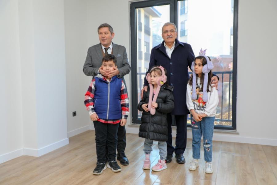 Yeni evlerini gezen aileler ve çocuklarla sohbet eden Başkan Murat Aydın evlerin şimdiden hayırlı olmasını temenni etti.