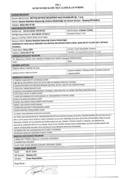 BEYTAŞ A.Ş. PERSONEL ALIM DUYURUSU (Muhasebe Müdürü - Belirsiz Süreli)