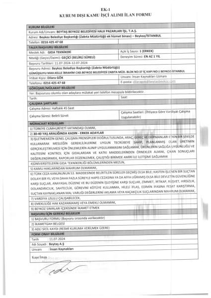 BEYTAŞ A.Ş. PERSONEL ALIM DUYURUSU (Gıda Teknikeri - Geçici (Belirli Süreli))