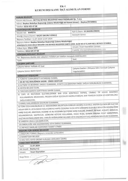 BEYTAŞ A.Ş. PERSONEL ALIM DUYURUSU (Barista - Geçici (Belirli Süreli))