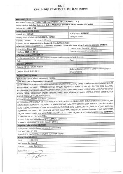 BEYTAŞ A.Ş. PERSONEL ALIM DUYURUSU (Fırıncı - Geçici (Belirli Süreli))
