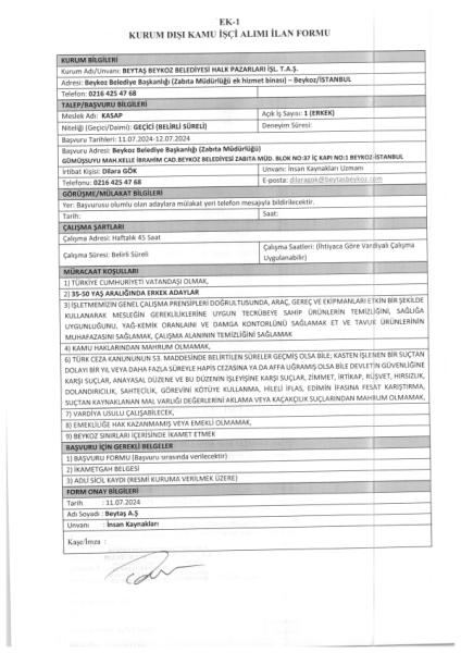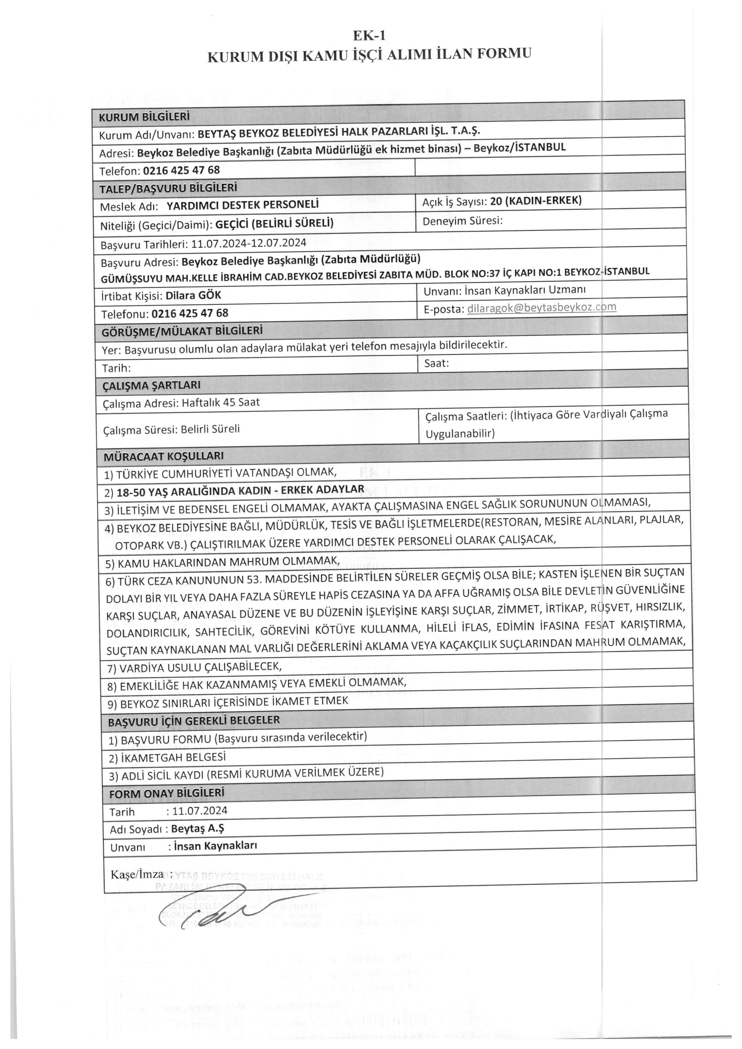 BEYTAŞ A.Ş. PERSONEL ALIM DUYURUSU (Yardımcı Destek Personeli - Geçici (Belirli Süreli))