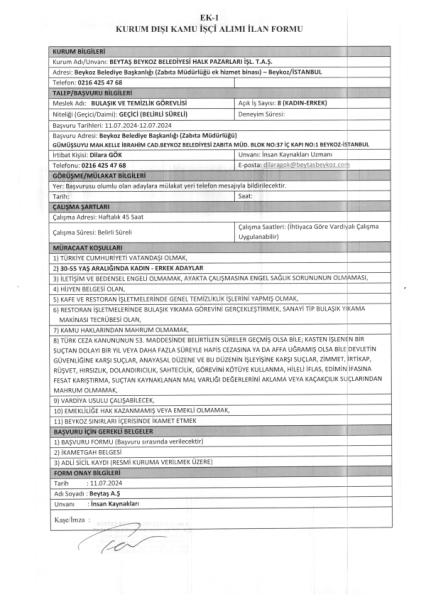 BEYTAŞ A.Ş. PERSONEL ALIM DUYURUSU (Bulaşık ve Temizlik Görevlisi - Geçici (Belirli Süreli))