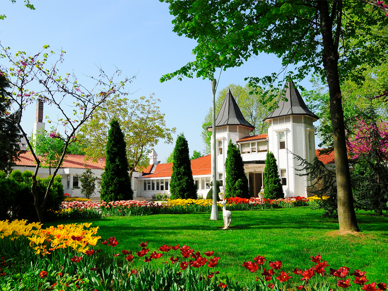 Abraham Paşa'nın mülkiyetindeyken, koru Fransız bahçe uzmanları tarafından düzenlenmiş, içinde köşkler, kuşhaneler ve havuzlar inşa edilmiştir. Türkiye ikliminde doğal olarak yetişmeyen, yurtdışından getirilmiş egzotik bitki ve ağaçlar dikilmiştir. Koru içinde küçük bir tiyatro yaptırılmışsa da, bu tiyatro 1937 yılında çıkan bir yangında yıkılmıştır. İki büyük yapay mağara, beş havuz, kayalarla oluşturulmuş 3 yapay çağlayan bulunmaktadır. Havuzlardan birinin içinde küçük bir yapay ada vardır.